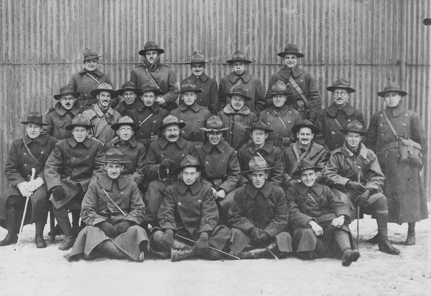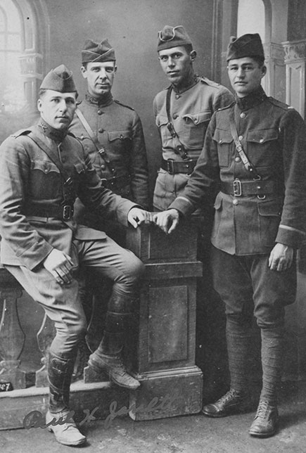 The four platoon commanders from Company M, 166th Infantry Regiment, 42nd “Rainbow” Division, pose for a photo before their first all-American attack on the German trenches in the Bois de Chien (Dogwoods) just outside of Neuviller, France, May 3rd, 1918 (Paul is seated on the far left).