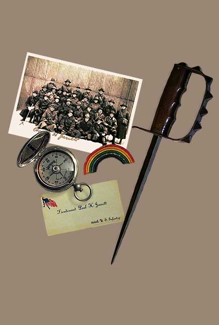 Paul’s personal items from left to right: Photo of the 2nd Lieutenants that were chosen from the 166th Infantry Regiment just before they boarded buses to head to the British trenches to receive their training in “trench knives and bayonets.” It was Christmas Eve, 1917.