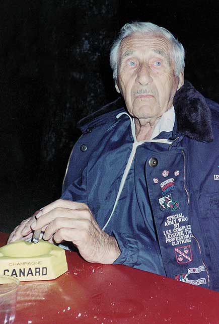Paul Jarrett, age 94, relaxes after exploring the German trenches and cement bunkers that he and his platoon attacked on May 3, 1918, outside of Neuviller. With 1,000 men of the “Rainbow” Division attacking the enemy, his mission was to make it all the way to the 2nd-line German trench, clear it out, and return to his trench-line, which literally ran down the middle of main street in Neuviller. His mission was a total success with the loss of only one of his men.