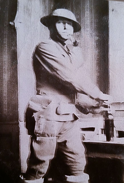 Paul as he entered his quarters, a deserted French house in Neuviller, France, in May of 1918. As Officer of the Day, he has just returned from searching the entire village for Germans that had infiltrated the town the night before and had killed an American sentry. Notice his holster is still pulled back exposing his Colt .45. Also, the wine bottle does not hold wine, it actually holds oil for the officers to lubricate their Colt .45s.